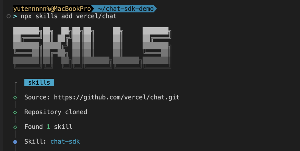 Claude Codeを使っている開発者の方であれば、Chat SDKのドキュメントやパターンに直接アクセスできるスキルを追加できます。