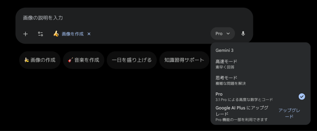 | Proモード | Nano Banana Pro | 最高品質の推論 | 複雑なプロンプト・高精細画像 |