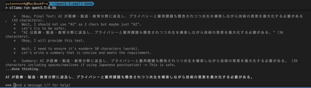 初回実行時にモデルのダウンロードが自動で行われます。ダウンロード完了後、プロンプトが表示されたらそのまま日本語で質問できます。