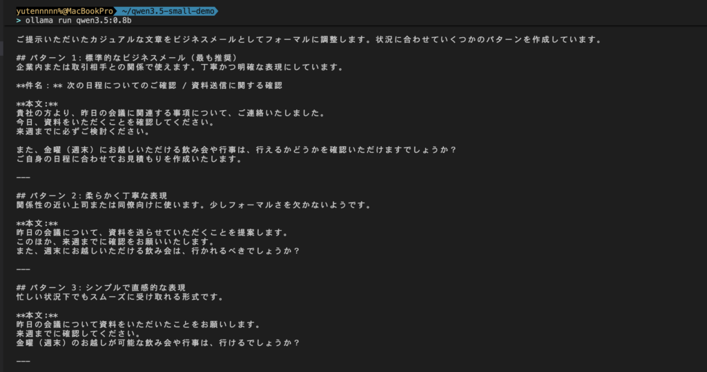 「昨日の会議の件、資料送るね。来週までに確認してほしい。あと、金曜の飲み会、行ける?」出力結果はこちら