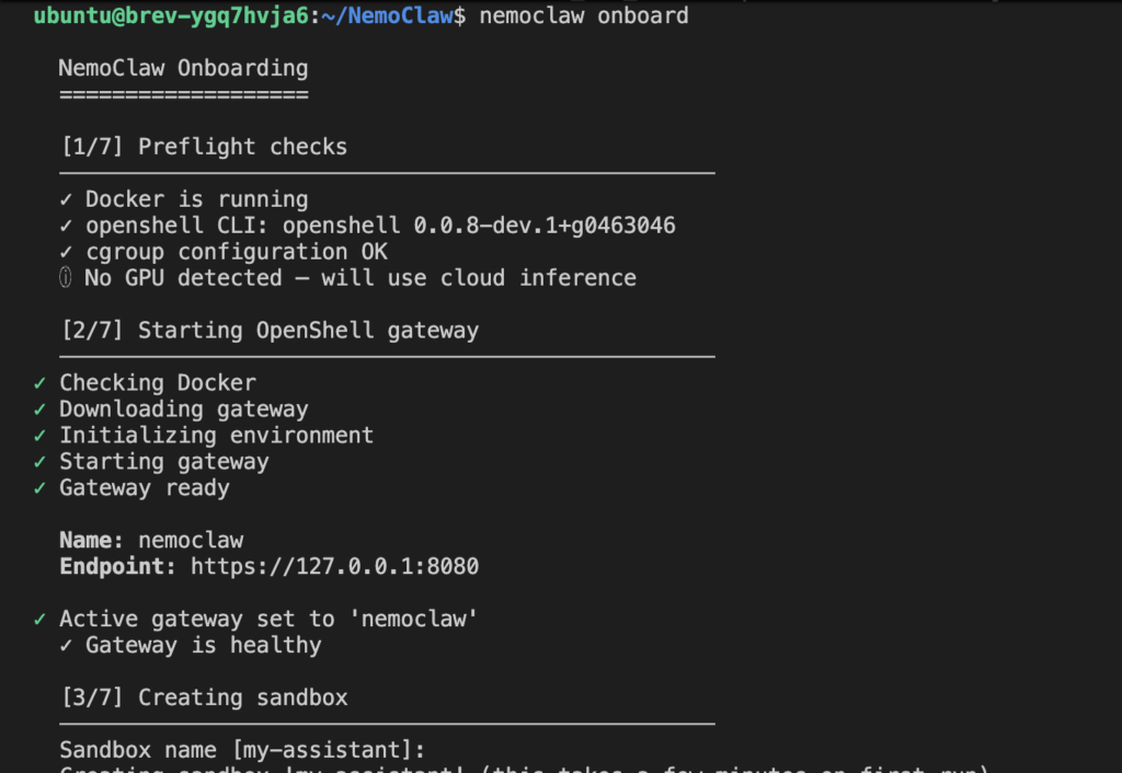 Brevのおかげで環境構築にほとんど時間がかからず、Mac上のブラウザだけで数分でNemoClawの動作環境が整いました。Ubuntuマシンを自前で用意する必要がないのは、検証目的ではかなりありがたいポイントです。