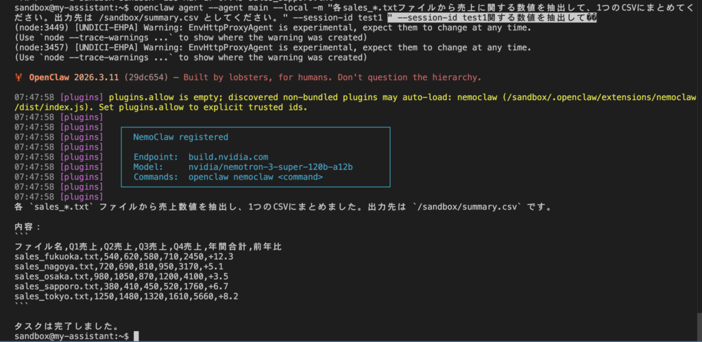最初に試したのは、サンドボックスの制御がきちんと機能しているかの検証です。Brev上のインスタンスにいくつかのサンプルテキストファイルを配置し、「各ファイルから売上に関する数値を抽出して、1つのCSVにまとめてください」と自然言語で指示しました。