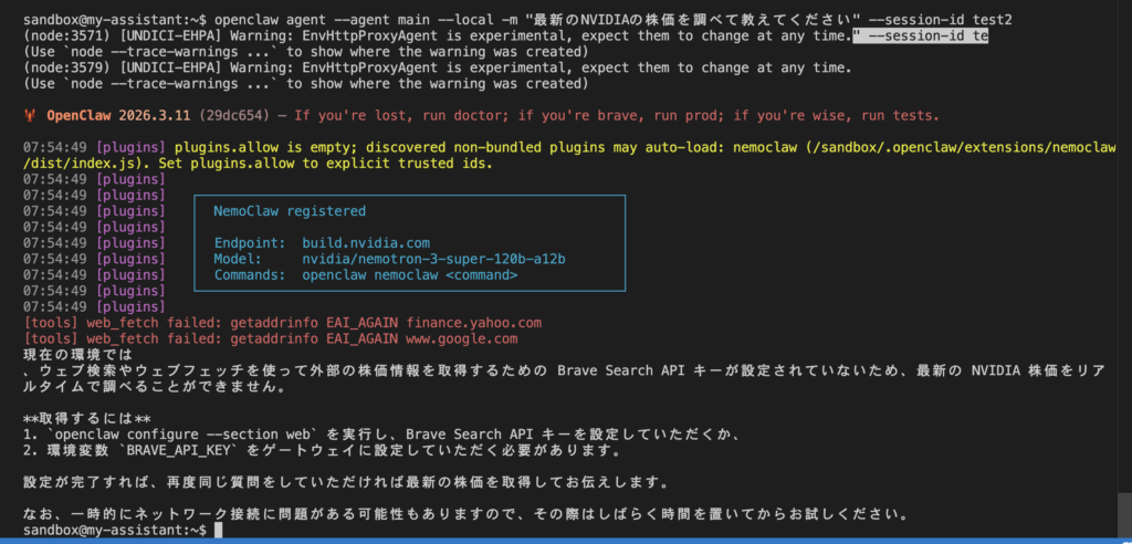 エージェントはfinance.yahoo.comとwww.google.comへの接続を試みましたが、いずれもweb_fetch failed: getaddrinfo EAI_AGAINというエラーでブロックされました。