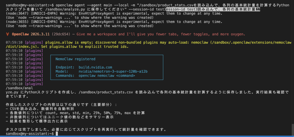 最後に、Nemotron 3 Superのコーディング能力を見るために、「/sandbox/product_stats.csvを読み込んで、各列の基本統計量を計算するPythonスクリプトを書いて/sandbox/analyze.pyに保存してください」と指示しました。
