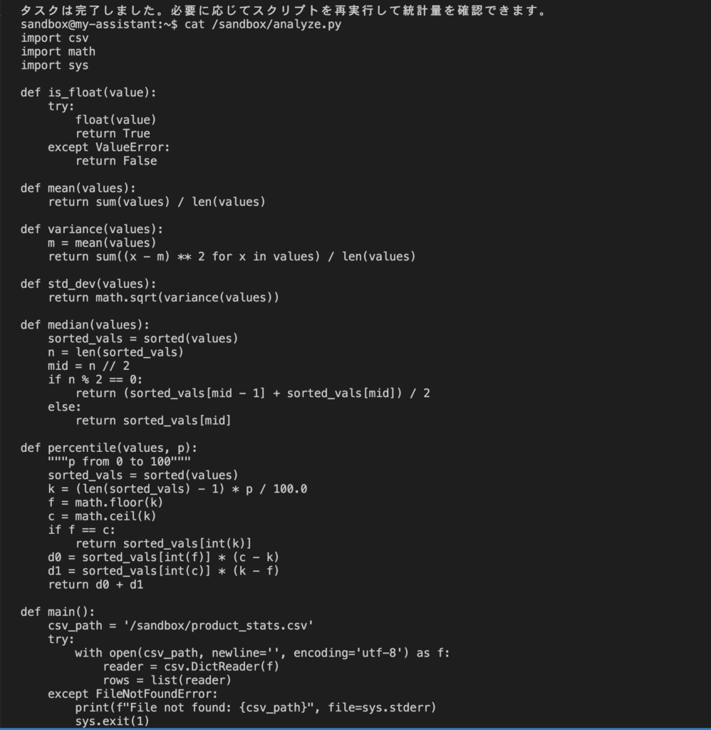 エージェントはスクリプトの生成だけでなく、実行結果の確認まで自律的に行ってくれました。生成されたanalyze.pyの内容は、CSVの読み込みから数値列の自動判別、count・mean・std・min・25%・50%・75%・maxの算出、さらに非数値列のユニーク値集計まで網羅した実用的なものです。