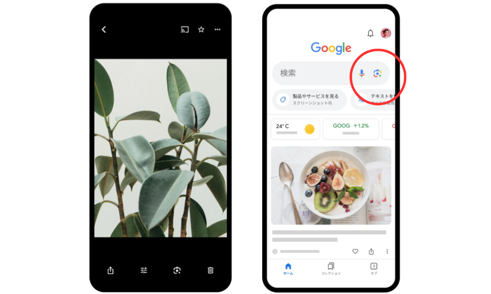 カメラや保存済みのスクリーンショットから直接検索でき、リアルタイムで情報を引き出せます。商品名・植物・建物・文字など、幅広い対象に対応しています。