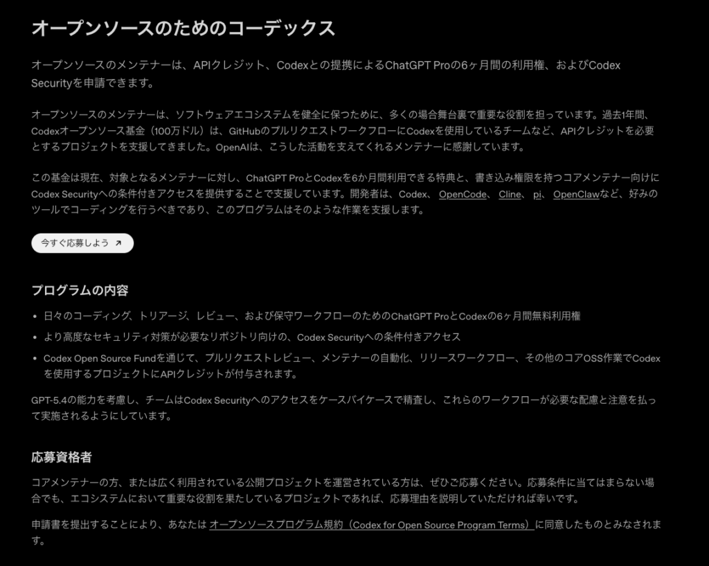なお、2026年2月からOpenAIはサイバー防御加速のため1,000万ドル分のAPIクレジット提供を表明しています。