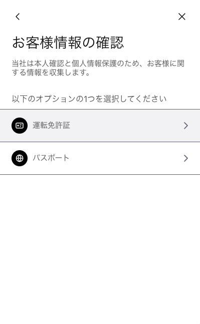 居住国を選択したら、運転免許証もしくはパスポートで本人確認です。