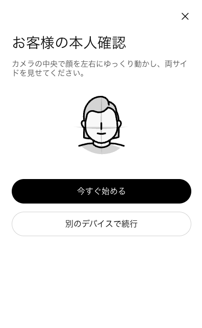 運転免許証もしくはパスポートの認証が完了したら、カメラ撮影で本人確認です。筆者はパソコンの外部カメラで認証を行いましたが、スマホやノートパソコン内蔵のカメラで行う方が楽かもしれません。
