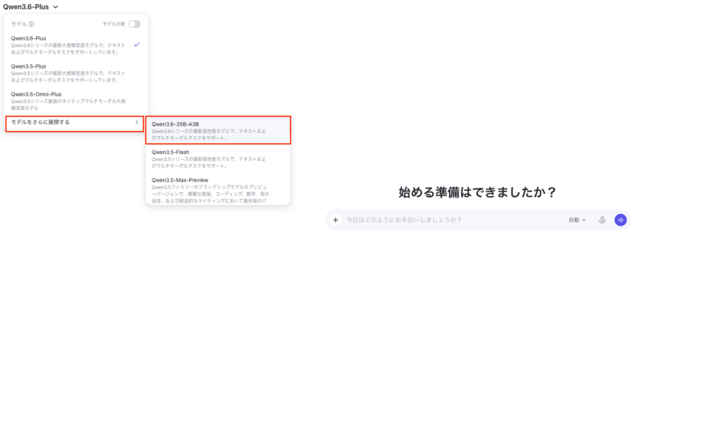 使用する際には、「モデルをさらに展開する」を選択して、Qwen3.6-35B-A3Bを選んでください。