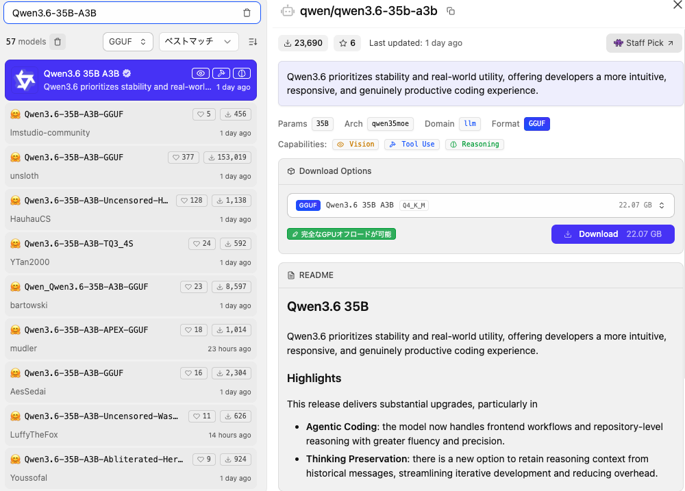 使い方ではQwen Studioで使用をしてみましたが、ここではLM StudioにQwen3.6-35B-A3Bをダウンロードして使ってみたいと思います。