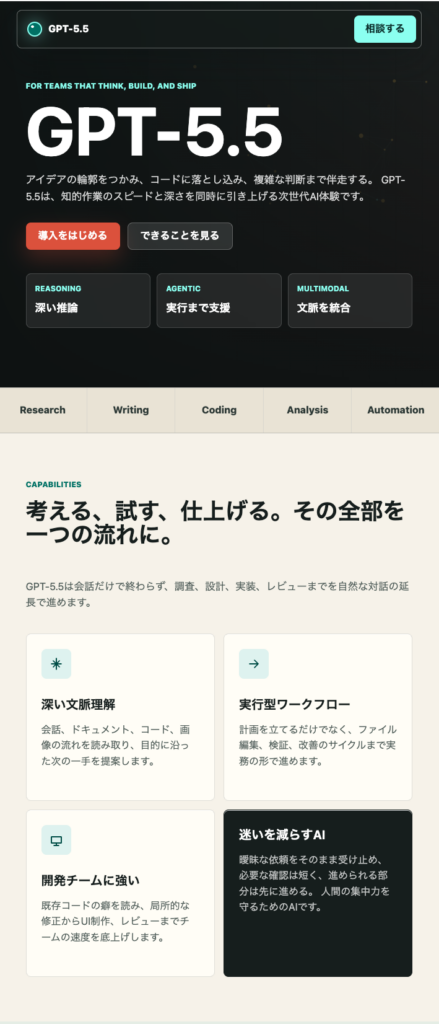 ここでは、GPT-5.5の実際の動作を検証した結果を紹介します。先ほどはGPT-5.5のLPを作ってもらいましたが、AIが作成した感じが否めなかったので、もう少し修正を加えていきます