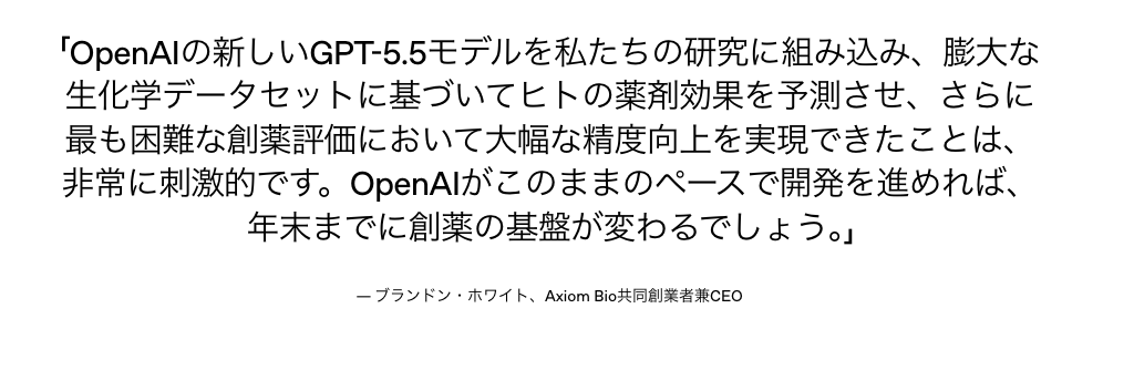 実際にAxiom Bioのブランドン・ホワイト共同創業者兼CEOは、大規模な生化学データセットでヒトにおける薬剤アウトカム予測をするハーネスでGPT-5.5を活用し、最も難しい創薬評価で大幅な精度向上を確認しています。