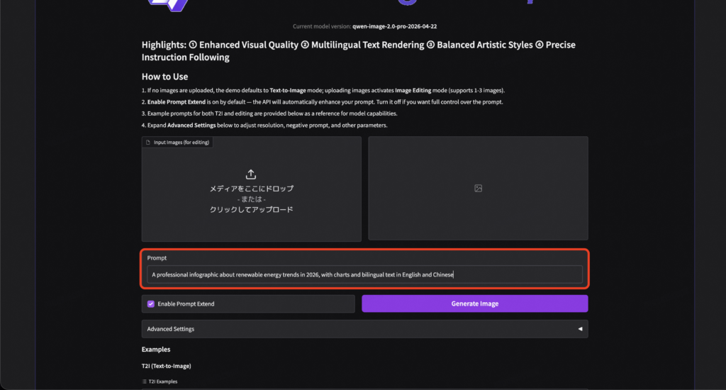 プロンプト入力欄に、生成したい画像の説明を英語または中国語で入力します。例えば「A professional infographic about renewable energy trends in 2026, with charts and bilingual text in English and Chinese」のように、具体的に書くほど精度が上がります。