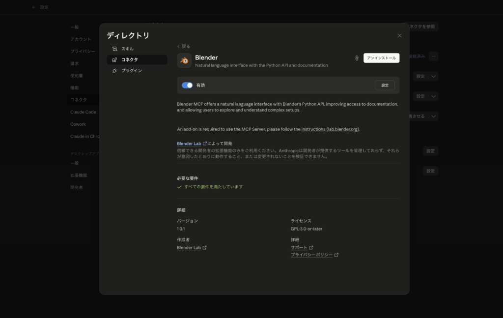 Claude Desktopを開き、「設定」→「コネクタ」を選択します。検索バーで「Blender」と入力し、表示されたBlenderコネクタの+ボタンをクリックします。